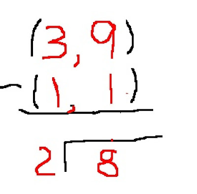After looking at this for a few seconds, I thought that I understood what Lisa’s intentions were. However, I could see problems with her notation. To check, I asked what the symbols between the numbers in parentheses meant and she made clear to me that they were dashes, not subtraction signs. I asked about the slash and she said, “Oh, that means that you divide the two into the eight to get four, which would be the slope.”This was what I thought she meant, but I asked her if it seemed possible that most people would be confused by what seemed like indicated subtractions, and if she felt that math teachers would be very distressed by the idea that what she’d written at the bottom should be read the way she intended. She said, “Oh, I see what you mean about the dashes. But I don’t see what’s wrong with the bottom part.”